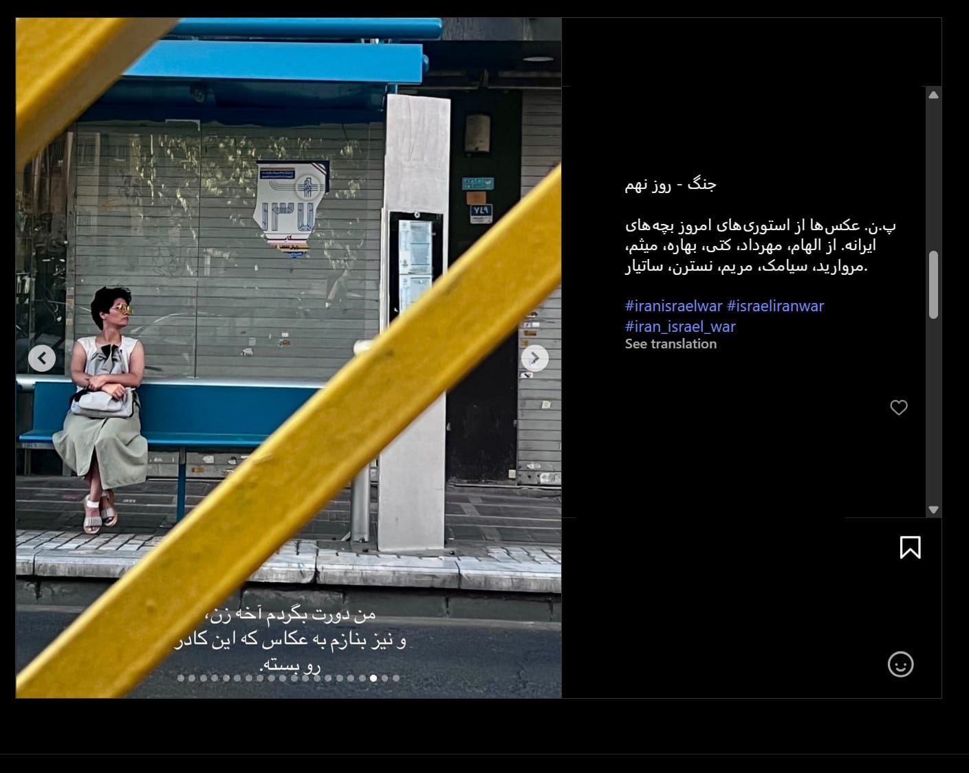 همسر رضا پهلوی که در رؤیای ملکهشدن هرگونه تعقل و خویشتنداری را از دست داده، در روزهایی که ما دلنگران خانهها، خانوادهها، شهرها و همشهریانمان بودیم، پیامی شرمآور در فضای مجازی منتشر میکند. او برای متجاوز خارجی دست میزند و با فریاد «اسرائیل بزن، خوب میزنی» به استقبال جنگ میرود. در این میان که ما ازحقارت وابستگان و بیاعتنایی به اصطلاح «ایرانگرایان» به جان و زندگی مردم ایران، خشمگین هستیم، قاب دیگری روبرویمان جلوه میکند، مردی در بین دود و صدای بمباران در خیابانهای تهران ویلُون میزند ، مردی با دختر خردسالش بین مردمی که در صف طولانی بنزین هستند شربت پخش میکند، آنها خود تابلوی زیبایی میشوند برای تصویرگری از مقاومت. زنی با پوششی در تضاد با سلطه جمهوری اسلامی و نمایی از صلابت جنبش انقلابی «زن، زندگی ، آزادی»، بیتفاوت به نظام سرکوب در برابر دشمن داخلی، جمهوری اسلامی، و بمبهای دشمن خارجی، اسرائیل، در ایستگاه اتوبوس نشسته است: مقتدر، استوار، و بدون نیاز به مُنجی! و من دوباره به یاد نمادها و مقاومتهای جنبش انقلابی «زن زندگی آزادی» میافتم که برخی گمان میکنند تمام شده است.